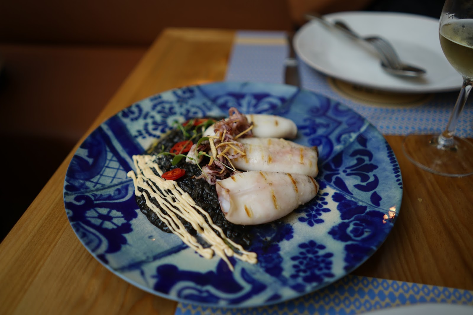 Como prato de peixe Lulas Grelhadas nas brasas com um delicioso arroz negro com maionese de alho e kimchi.