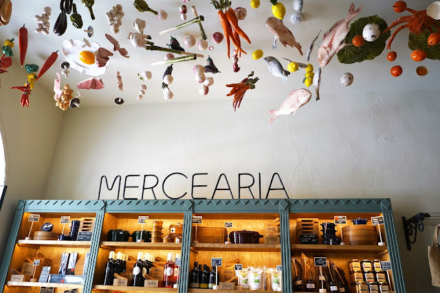 Logo à entrada encontra-se a Mercearia onde podemos comprar diversas iguarias que dividem o espaço com livros, aventais e outros acessórios dignos de um verdadeiro chef.
