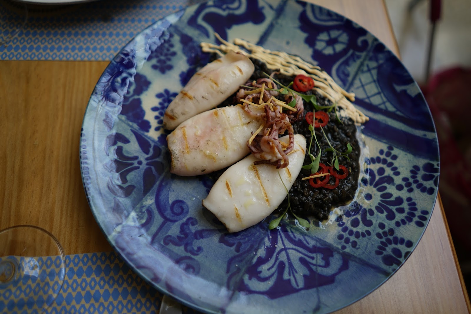 Como prato de peixe Lulas Grelhadas nas brasas com um delicioso arroz negro com maionese de alho e kimchi.
