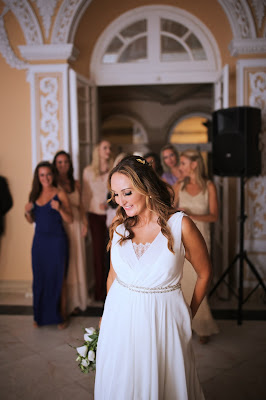 O vestido de corte império em crepe de seda, com aplicações de renda (entredós Juliette) e um cinto em pedraria Pavé, era super confortável e fresco. Claramente uma mais-valia, dado que no dia 3 de Setembro fez imenso calor!