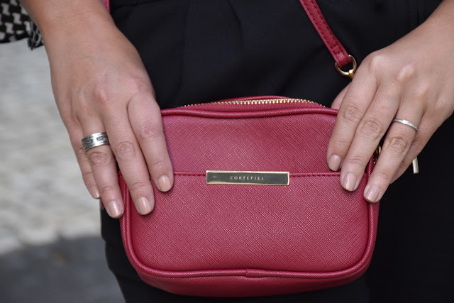 Adoro looks em preto e branco, pela sua versatilidade e porque ficam igualmente perfeitos quando associados com uma outra tonalidade. Por esse motivo escolhi uma carteira em vermelho cereja para conferir um toque de cor a este outfit.